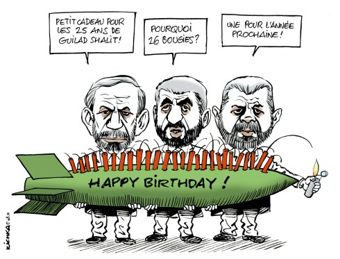 Pendant des années j’ai modestement soutenu la famille de Guilad Shalit du bout de mon pinceau. Aujourd’hui je suis heureux de savoir sa libération imminente et je félicite Bibi pour le courage de sa décision (une fois n’est pas coutume!).
